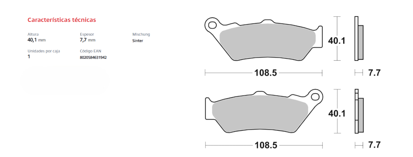 Compuesto sinterizado, específico para aplicación delantera, caracterizado por una óptima eficiencia en cualquier condición de uso. Es la alternativa ideal a las pastillas originales. Este compuesto está caracterizado por el desgaste limitado que asegura una duración y un kilometraje adecuados.